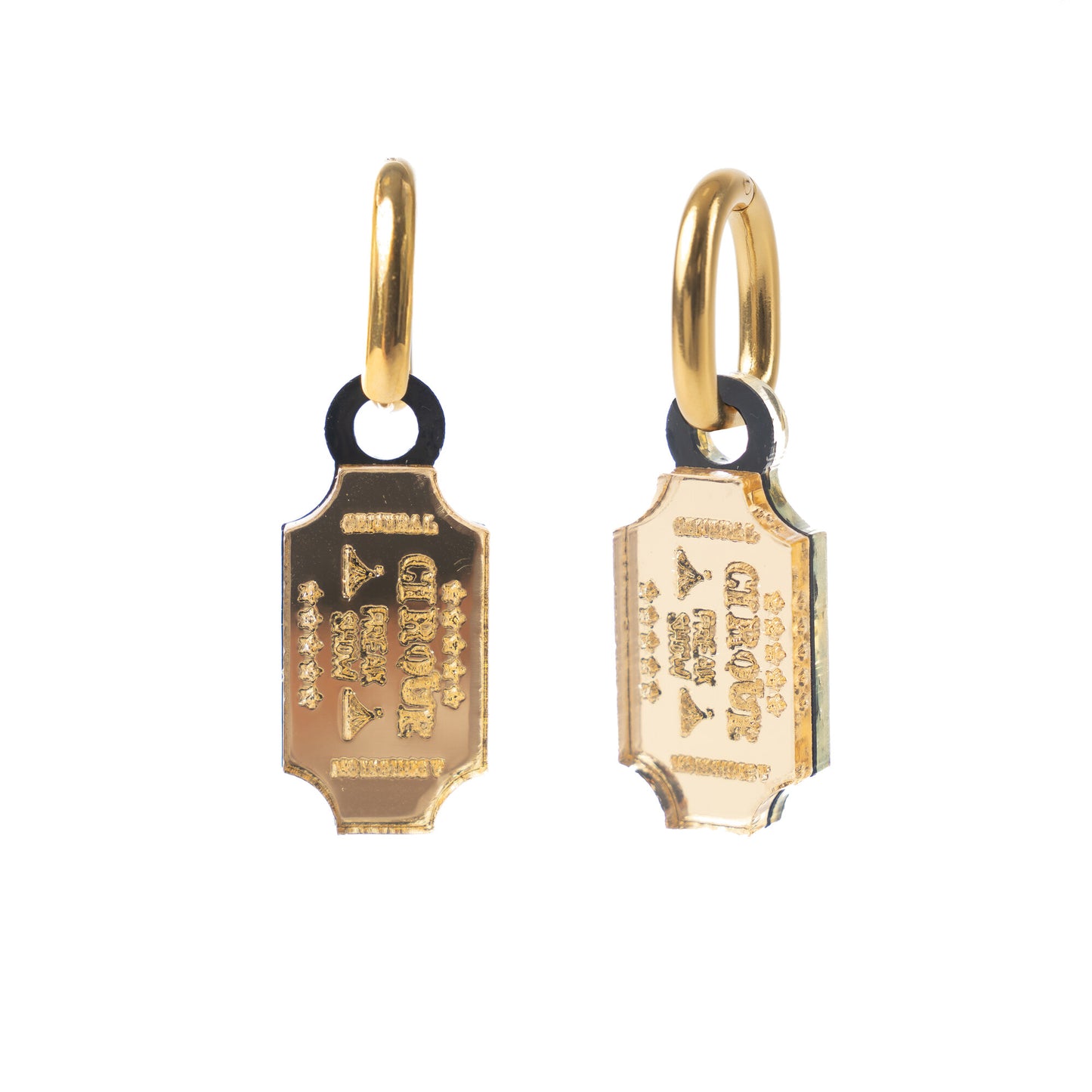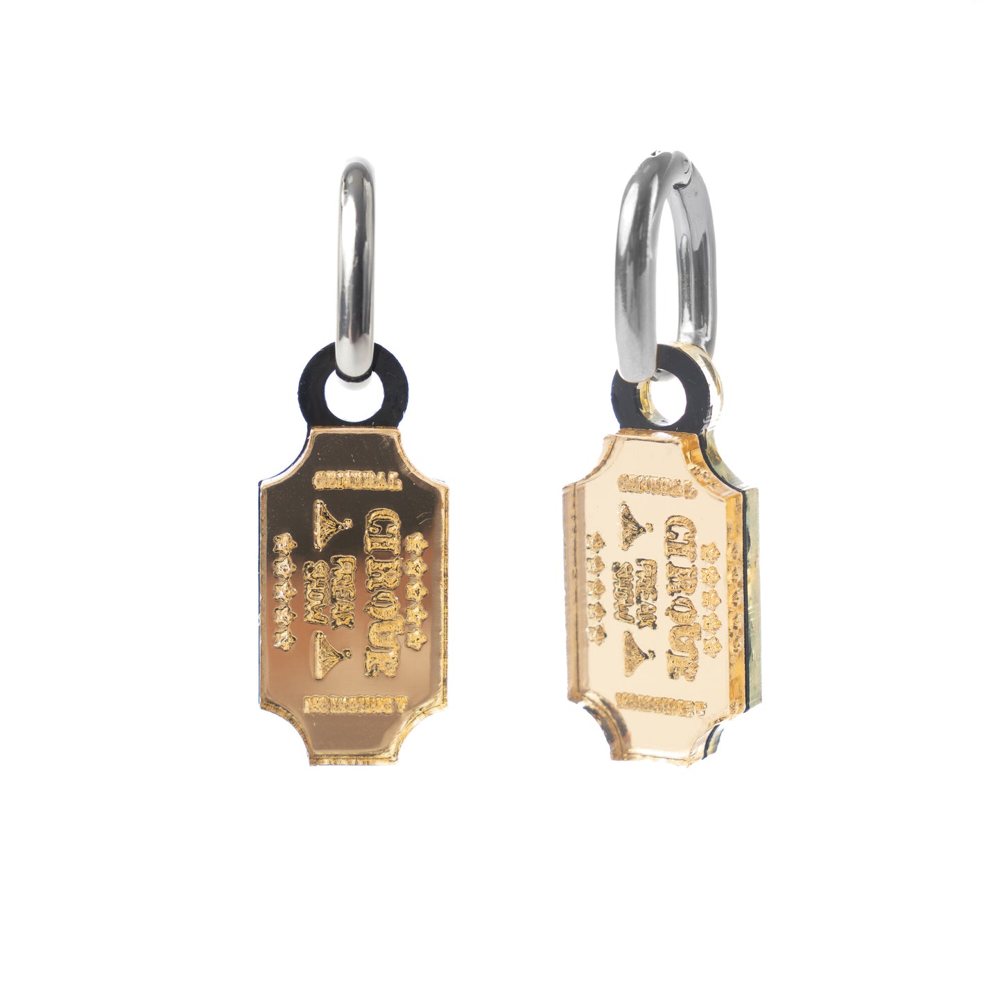 Roll up, roll up and make a bold statement with our Cirque Ticket Huggie Earrings, the perfect accessory for those who love to stand out! These unique earrings feature an intricately engraved circus ticket design, with the words "Freak Show" etched into gold-mirrored acrylic.