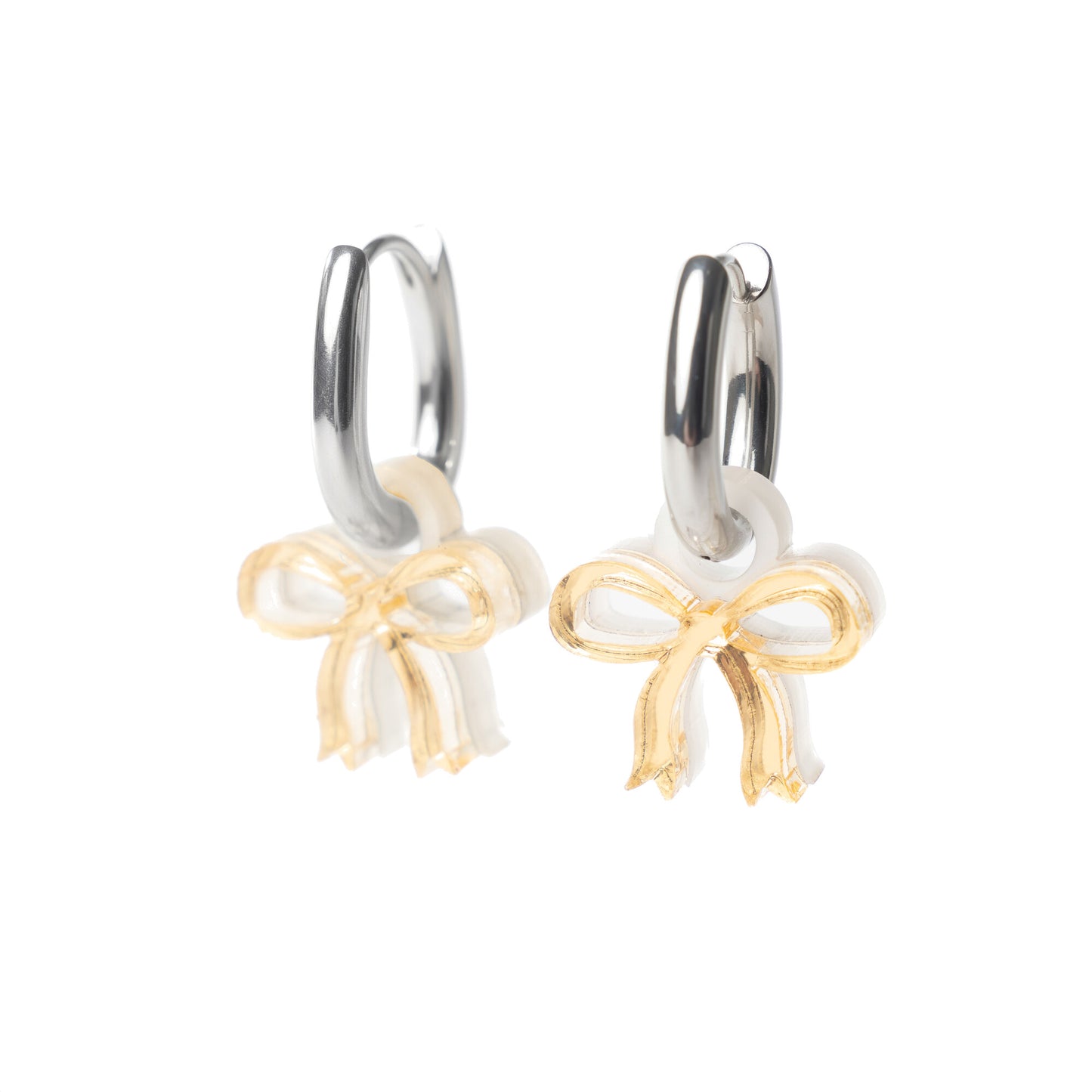 Add a playful yet chic touch to your look with our Bow Huggie Earrings, perfect for embracing the bow jewellery trend. These adorable, laser-cut bow earrings are crafted from high-quality mirror acrylic and plain acrylic, available in four stunning colours: pink, charcoal, gold, and silver.